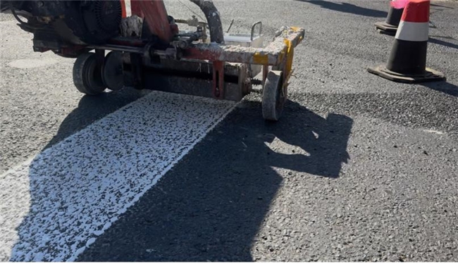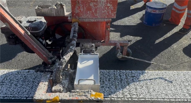 防滑骨料添加“新融合”。标线材料主要包含骨料与基料,为提高标线的防滑性能,本次试点选用含硬度高、棱角分明的防滑骨料标线涂料,涂料采用预混工艺,将高比例抗滑骨料在工厂预先混入涂料中,此方法施划的交通标线颗粒感明显,显著增强交通标线的抗滑性能。