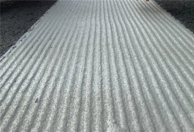 热熔标线拉毛“新工艺”。严格按照热熔标线材料要求控制涂料熔融温度,把划线机出料口后方的平刮板改造成锯齿状,将施划的交通标线拉毛成“微波浪”,显著增强交通标线的摩擦系数并能有效减少连续水膜成型。