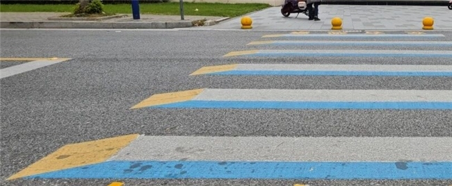 彩色立体标线“新设计”。采用立体标线设计,将人行横道线白色标线设计白色标线加彩色防滑路面标线,最大程度减少常规交通标线使用面积,从而科学提升人行横道整体防滑性能。
