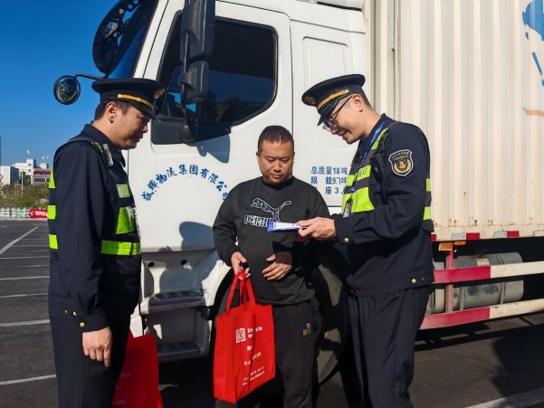 在宣教过程中,执法人员兼顾精准度与实用性。面向货运车辆驾驶员,结合典型案例,重点解读超限超载法律法规与大件运输审批规范,强调合法装载、安全运输的重要性;针对小型客车驾乘人员,则温馨提示高速公路行车安全须知,倡导自觉抵制疲劳驾驶,践行“车让人、人快走”的互动礼让风尚。此外,现场还设置有互动问答环节,巧妙融入安全知识与文明理念,参与者们不仅在轻松氛围中巩固学习成效,还收获了精美小礼品。