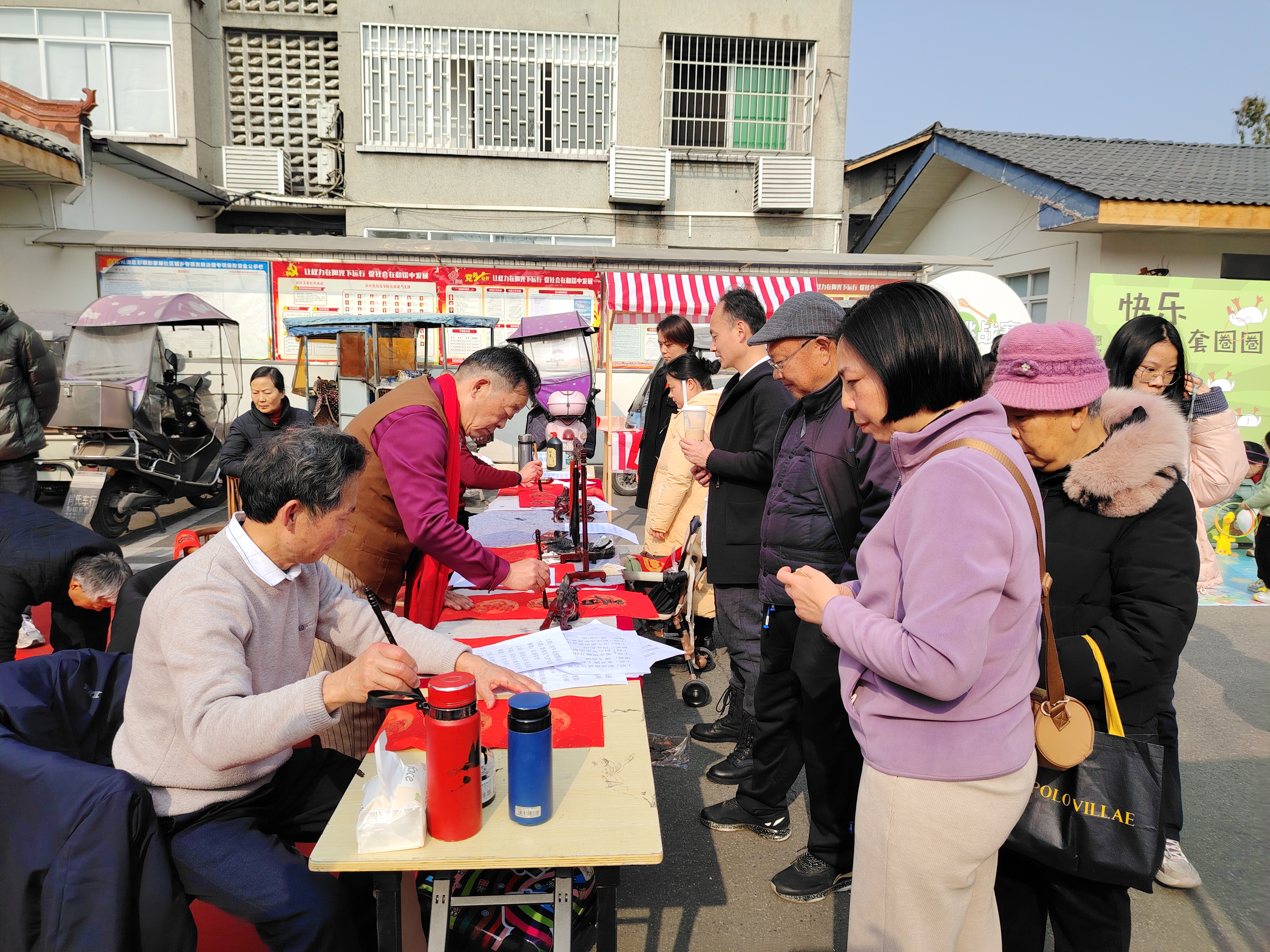 多元展区共绘年味画卷:中庭墨香四溢,居民与达人共写百余副春联;问艺空间手工烙画葫芦展位,闵老师以烙笔勾勒社区地标,引得居民争相体验非遗技艺;国学堂编织手作展位将传统编织与现代设计融合,手作包包、挂坠成“年味伴手礼”。公益行动区暖意涌动,义剪区为50岁以上居民免费理发,义磨区蒋师傅传授刀具保养技巧,让钝旧刀具焕然一新;人民建议征集区收集到10条关于环境改造、非遗传承的建议;成都农商银行双流支行金融知识普及区通过趣味问答普及防诈技巧,送上“福袋”传递新春祝福。飞花令擂台赛、投壶套圈等传统游戏区域亲子互动温馨,搅搅糖与糖葫芦亲子工坊吸引20组家庭参与,用“甜蜜”串联文化记忆与家庭温情。